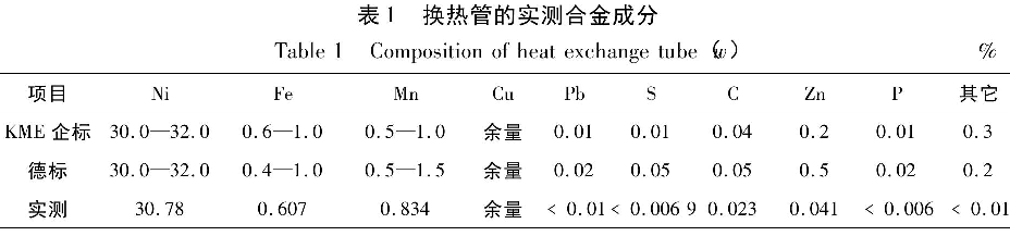 B30換熱管的實(shí)測(cè)合金成分如表1所示。由表1可知,該管段的實(shí)測(cè)合金成分均滿足德國(guó)KME公司企標(biāo)和德國(guó)標(biāo)準(zhǔn)要求,表明該管線的成分滿足設(shè)計(jì)要求。