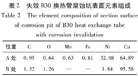 腐蝕坑表面外圍(A處)和底部(B處)的SEM及EDS結(jié)果如圖7和表2所示,可見,在蝕坑外,Ni元素含量32.08%(ω),Cu元素含量為64.89%(ω),材料成分符合B30合金特征;在蝕坑內(nèi),Ni元素的較低含量?jī)H1.84%,遠(yuǎn)低于B30合金的Ni含量。