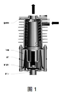 如圖(1)所示,由空壓機(jī)輸出的壓縮空氣經(jīng)進(jìn)氣口進(jìn)入散熱閥體與內(nèi)腔之間的螺旋通道,溫度下降,產(chǎn)生冷凝,在分離區(qū)使壓縮空氣中的水、油分離。通過(guò)桿狀濾芯,進(jìn)入排放通道。打開排氣膜片,油水被收集在集液腔。