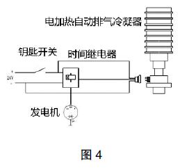如圖4所示:a、打開整車鑰匙開關(guān),不銹鋼冷凝器正負(fù)很導(dǎo)通,但時(shí)間繼電器回路不通,故電控不銹鋼冷凝器底部電磁閥不通電。b、打開整車鑰匙開關(guān),不銹鋼冷凝器正負(fù)很導(dǎo)通,同時(shí)啟動(dòng)發(fā)動(dòng)機(jī),發(fā)電機(jī)開始發(fā)電。同時(shí)發(fā)電機(jī)D端給時(shí)間繼電器一個(gè)電源,時(shí)間繼電器開始計(jì)時(shí),10分鐘后,時(shí)間繼電器閉合發(fā)出信號(hào)并持續(xù)1秒,控制不銹鋼冷凝器排出油污及水分。